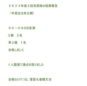 by kiko 2023年11月22日 【2023年11月】2023年度2回目 英検合格おめでとうございます 講師 投稿ナビゲーション « 【2023年9月】子育てになれている講師です【2023年11月】今年12月15日までに入会手続き完了の方のみ » Related Posts ★2026年1月★ 英語でクワガタの観察日記&標本 ★2026年1月★ Happy New Year ⛄ ★2025年11月★ 未就学児体験レッスン 保育園レッスン